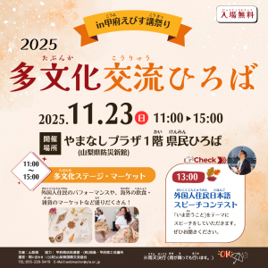 2025(令和7)年11月16日(日)午前10時から午後3時30分まで、甲府市の小瀬スポーツ公園で行われる県民の日記念行事に「みんなで体験しよう 多文化ふれあい」ブースを出展します。